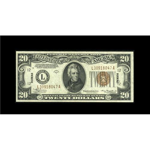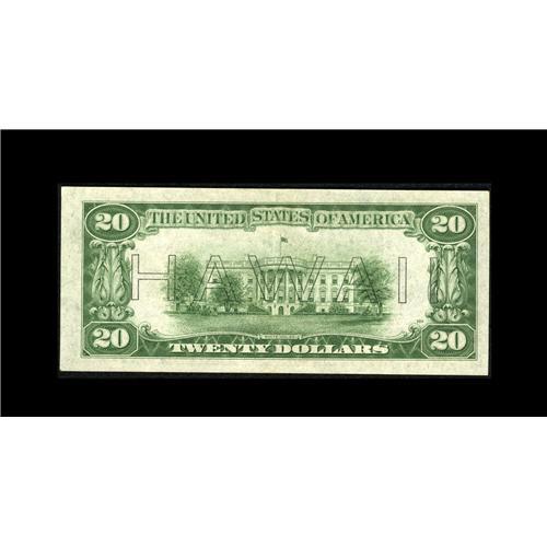 <B>Fr. 2305 $20 1934A Hawaii Federal Reserve Note. About Uncirculated.</B></I><BR>Three faint folds are detected on this Hawaii $20 that does appear Uncirculated.