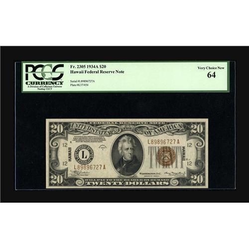 <B>Fr. 2305 $20 1934A Hawaii Federal Reserve Note. PCGS Very Choice New 64.</B></I><BR>Nice margins are noticed on this bright Hawaii $20.<BR><I>From The George P. Hammerly Collection</B></I><BR><BR><b>Shipping:</b> Coin/Currency (<a target="_blank" href="http://www.heritageauctions.com/common/shipping.php">view shipping information</a>)
