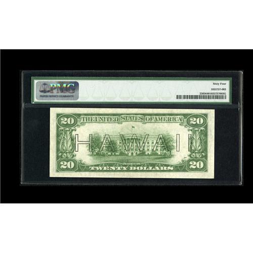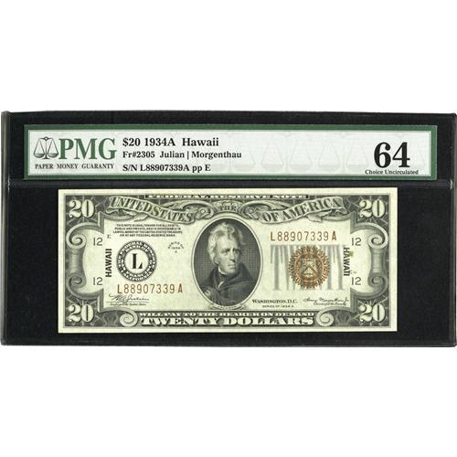 <B>Fr. 2305 $20 1934A Hawaii Federal Reserve Note. PMG Choice Uncirculated 64.</B></I><BR>Embossing is noticed on this crisp Hawaii $20 that is sufficiently margined.