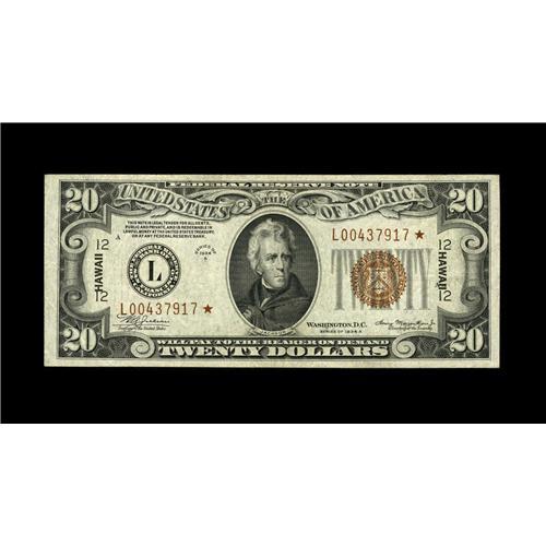 <B>Fr. 2305* $20 1934A Hawaii Federal Reserve Note. Very Fine.</B></I><BR>The circulation is light on this well-margined star.<BR><I>From The Bill and Kathy Stella Currency Collection</B></I><BR><BR><b>Shipping:</b> Coin/Currency (<a target="_blank" href="http://www.heritageauctions.com/common/shipping.php">view shipping information</a>)