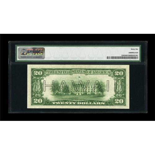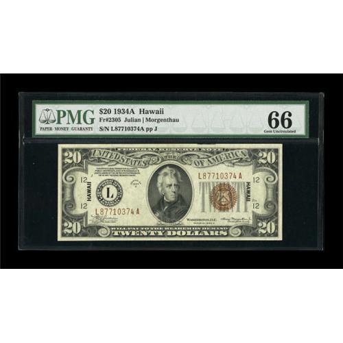 <B>Fr. 2305 $20 1934A Hawaii Federal Reserve Note. PMG Gem Uncirculated 66.</B></I><BR> A common enough note in grades up through 65, but a very scarce note in this state of preservation. <BR><BR><b>Shipping:</b> Coins & Currency (<a target="_blank" href="http://www.heritageauctions.com/common/shipping.php">view shipping information</a>)