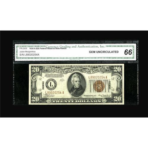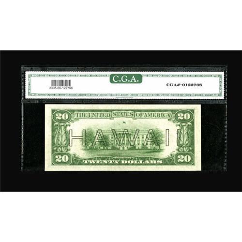 <B>Fr. 2305 $20 1934A Hawaii Federal Reserve Note. CGA Gem Uncirculated 66.</B></I><BR> A nicely centered example that is elusive in this state of preservation.<BR><BR><b>Shipping:</b> Coins & Currency (<a target="_blank" href="http://www.heritageauctions.com/common/shipping.php">view shipping information</a>)