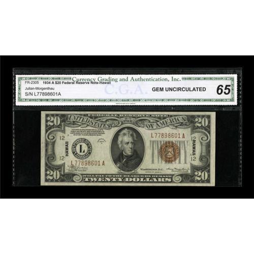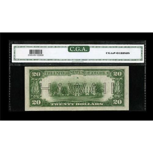 <B>Fr. 2305 $20 1934A Hawaii Federal Reserve Note. CGA Gem Uncirculated 65.</B></I><BR> Some embossing is noticed beneath the holder of this note with margins appropriate for the grade.<BR><BR><b>Shipping:</b> Coins & Currency (<a target="_blank" href="http://www.heritageauctions.com/common/shipping.php">view shipping information</a>)