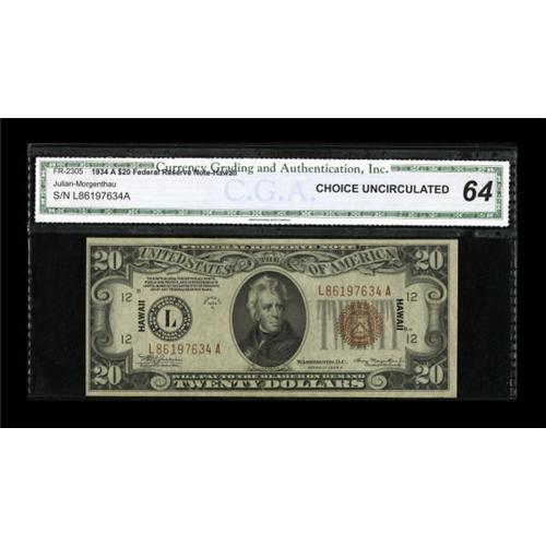 <B>Fr. 2305 $20 1934A Hawaii Federal Reserve Note. CGA Choice Uncirculated 64.</B></I><BR> A thin left margin is noticed on this nicely embossed Hawaiian.<BR><BR><b>Shipping:</b> Coins & Currency (<a target="_blank" href="http://www.heritageauctions.com/common/shipping.php">view shipping information</a>)