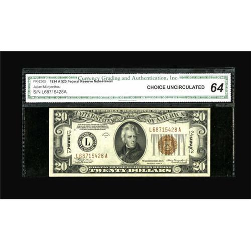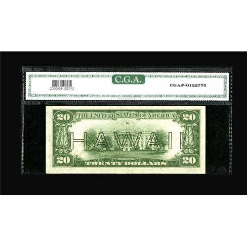 <B>Fr. 2305 $20 1934A Hawaii Federal Reserve Note. CGA Choice Uncirculated 64.</B></I><BR> A bright, pack fresh example of an always in demand issue.<BR><BR><b>Shipping:</b> Coins & Currency (<a target="_blank" href="http://www.heritageauctions.com/common/shipping.php">view shipping information</a>)