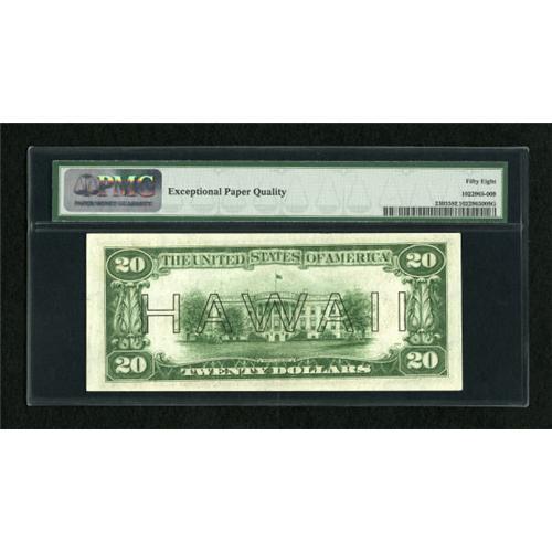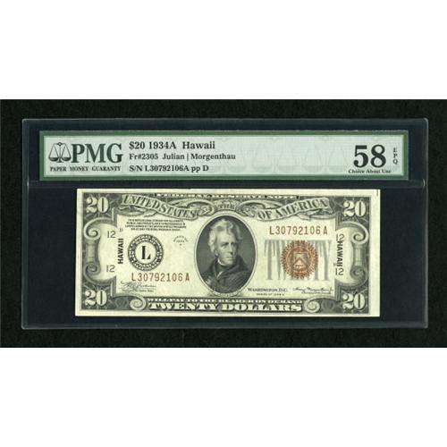 <B>Fr. 2305 $20 1934A Hawaii Federal Reserve Note. PMG Choice About Unc 58 EPQ.</B></I><BR> Original paper surfaces and rich ink colors are seen on this delightful emergency issue.<BR><BR><b>Shipping:</b> Coins & Currency (<a target="_blank" href="http://www.heritageauctions.com/common/shipping.php">view shipping information</a>)