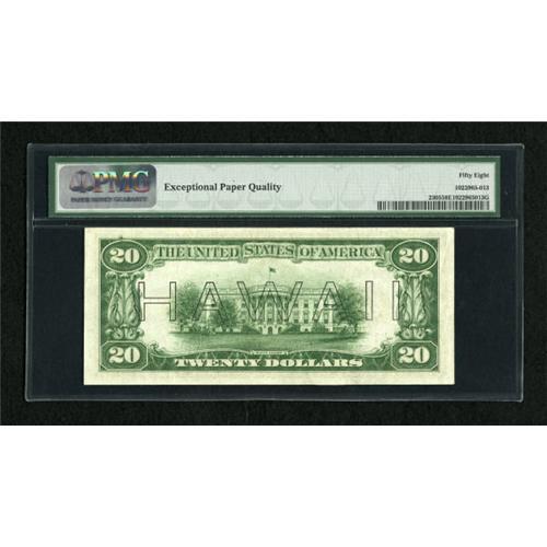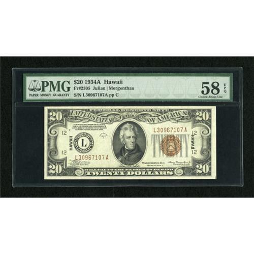 <B>Fr. 2305 $20 1934A Hawaii Federal Reserve Note. PMG Choice About Unc 58 EPQ.</B></I><BR> A fold to the far left keeps this well embossed Hawaii Twenty from a much higher grade.<BR><BR><b>Shipping:</b> Coins & Currency (<a target="_blank" href="http://www.heritageauctions.com/common/shipping.php">view shipping information</a>)