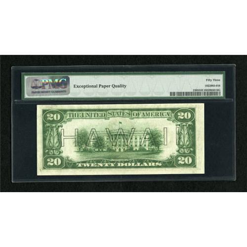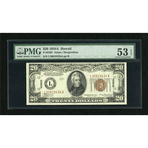 <B>Fr. 2305 $20 1934A Hawaii Federal Reserve Note. PMG About Uncirculated 53 EPQ.</B></I><BR> Good embossing is seen on this Hawaii Twenty that has a light centerfold and some corner handling.<BR><BR><b>Shipping:</b> Coins & Currency (<a target="_blank" href="http://www.heritageauctions.com/common/shipping.php">view shipping information</a>)