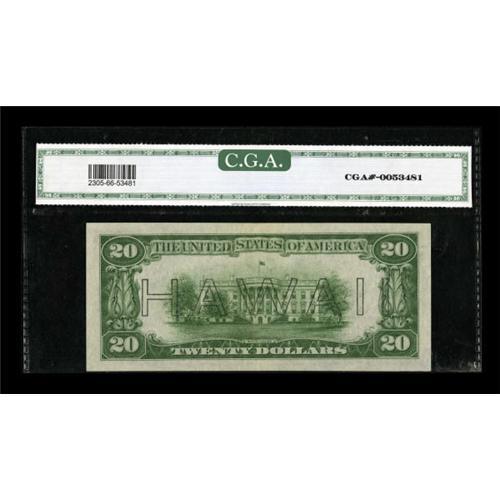 <B>Fr. 2305 $20 1934A Hawaii Federal Reserve Note. CGA Gem Uncirculated 66.</B></I><BR> Embossing of the serial numbers is noted on this Gem Hawaii. The margins are sizeable for the issue.<BR><BR><b>Shipping:</b> Coins & Currency (<a target="_blank" href="http://www.heritageauctions.com/common/shipping.php">view shipping information</a>)