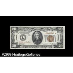 <B>Fr. 2305* $20 1934A Hawaii Mule Federal Reserve Note. About Uncirculated.</B></I><BR>A very rare Mule star which bears the highest number of any recorded in the Oakes census. This is an extremely difficult note to obtain in any grade, and especially in this state of preservation. A small repaired split at the bottom which barely enters the design must be mentioned for total accuracy in description. Lot:16652