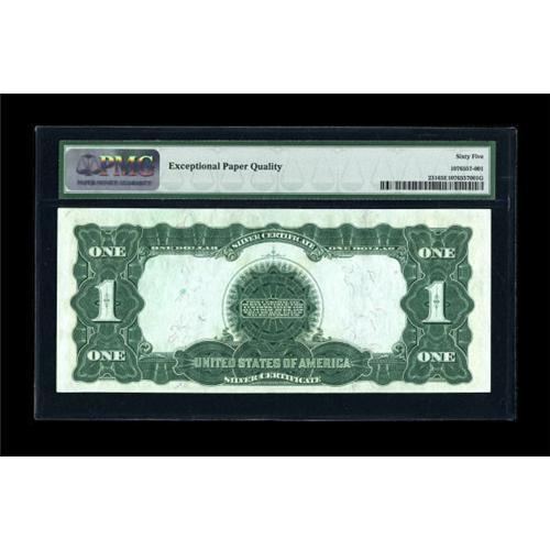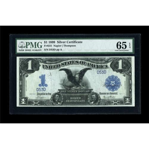 <B>Fr. 231 $1 1899 Silver Certificate Low Serial Number PMG Gem Uncirculated 65 EPQ.</B></I> Two digit serial number D53D graces this utterly pristine Napier-Thompson example that is strongly embossed and has wonderful margins. PMG has graded only four Napier-Thompson Black Eagles at this grade level, with just three higher. <BR><BR><b>Shipping:</b> Coins & Currency (<a target="_blank" href="http://www.heritageauctions.com/common/shipping.php">view shipping information</a>)