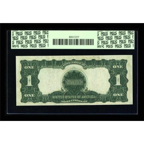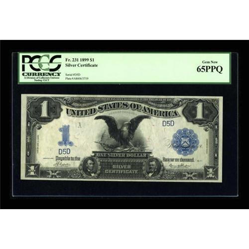 <B>Fr. 231 $1 1899 Silver Certificate Serial Number 5 PCGS Gem New 65PPQ.</B></I> This Serial Number 5 Napier-Thompson note is utterly fresh, with deep, original embossing, huge margins, ideal color and all the attributes required for the Gem New 65 grade noted on the holder. This is the lowest number ever to appear at public auction. A cut sheet bearing serial numbers 1-4 does exist, but it has never been offered at public sale and its whereabouts are currently unknown. This is a rare signature combination in its own right, but with this most desirable single digit number it is sure to generate much bidder interest, with a likely realization in the range of...<BR><BR><b>Shipping:</b> Coins & Currency (<a target="_blank" href="http://www.heritageauctions.com/common/shipping.php">view shipping information</a>)