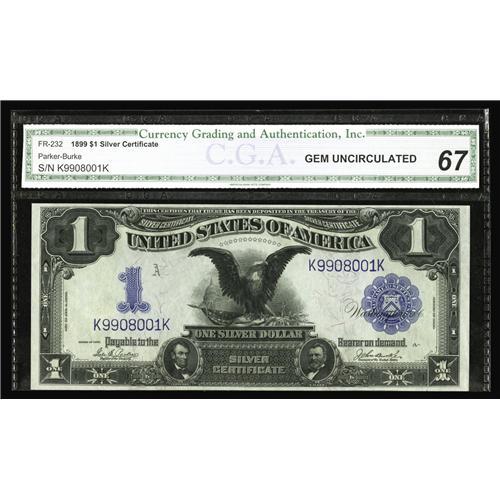 <B>Fr. 232 $1 1899 Silver Certificate CGA Gem Uncirculated 67.</B></I> Extraordinary margins surround this highly-graded Black Eagle.