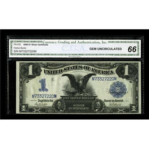 <B>Fr. 232 $1 1899 Silver Certificate CGA Gem Uncirculated 66.</B></I> A handsome 1899 Ace and a slightly less commonly seen number in top grade.<BR><BR><b>Shipping:</b> Coins & Currency (<a target="_blank" href="http://www.heritageauctions.com/common/shipping.php">view shipping information</a>)