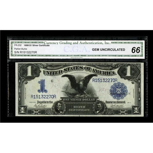 <B>Fr. 232 $1 1899 Silver Certificate CGA Gem Uncirculated 66.</B></I> Here is another pleasing Black Eagle which is quite fresh.<BR><BR><b>Shipping:</b> Coins & Currency (<a target="_blank" href="http://www.heritageauctions.com/common/shipping.php">view shipping information</a>)