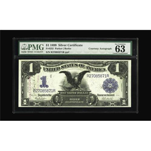 <B>Fr. 232 $1 1899 Silver Certificate Courtesy Autograph PMG Choice Uncirculated 63.</B></I> This note signed by Robert G. Hilton Asst't. Treas. US in Baltimore is well margined.