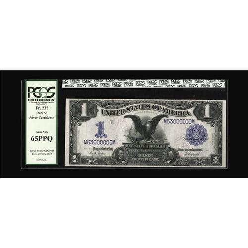 <B>Fr. 232 $1 1899 Silver Certificate PCGS Gem New 65PPQ.</B></I> A fine complement to the previous lot as they are consecutive. A little tighter margins are the reason for the grade.
