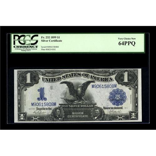 <B>Fr. 232 $1 1899 Silver Certificate PCGS Very Choice New 64PPQ.</B></I> A slightly tight top margin is likely what held this note at the 64 level, as it appears Superb in every other sense.<BR><BR><b>Shipping:</b> Coins & Currency (<a target="_blank" href="http://www.heritageauctions.com/common/shipping.php">view shipping information</a>)