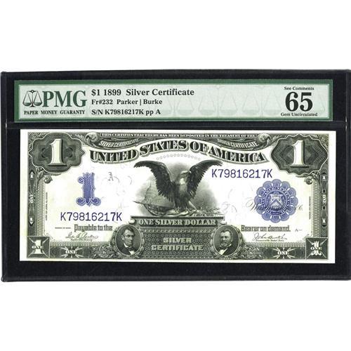 <B>Fr. 232 $1 1899 Silver Certificate PMG Gem Uncirculated 65 EPQ.</B></I> Original color and paper waves are readily apparent even in this third party holder.