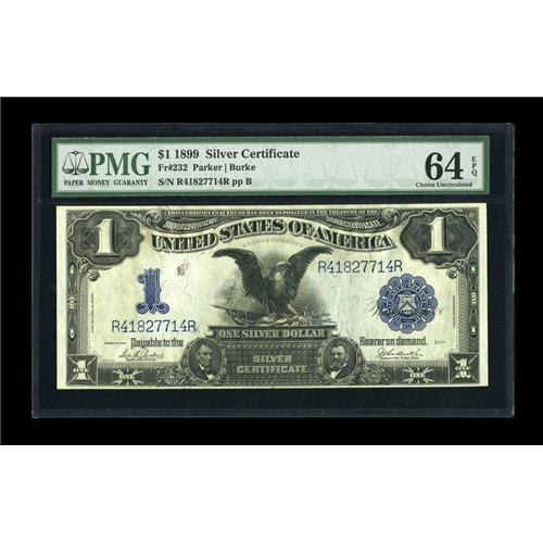 <B>Fr. 232 $1 1899 Silver Certificate PMG Choice Uncirculated 64 EPQ.</B></I> A near Gem originally embossed example that would make that grade but for just a slightly tight bottom margin both face and back.<BR><BR><b>Shipping:</b> Coins & Currency (<a target="_blank" href="http://www.heritageauctions.com/common/shipping.php">view shipping information</a>)