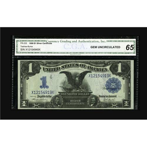 <B>Fr. 233 $1 1899 Silver Certificate CGA Gem Uncirculated 65.</B></I> Bright, well embossed surfaces are seen beneath the holder on this deeply inked Black Eagle.<BR><BR><b>Shipping:</b> Coin/Currency (<a target="_blank" href="http://www.heritageauctions.com/common/shipping.php">view shipping information</a>)