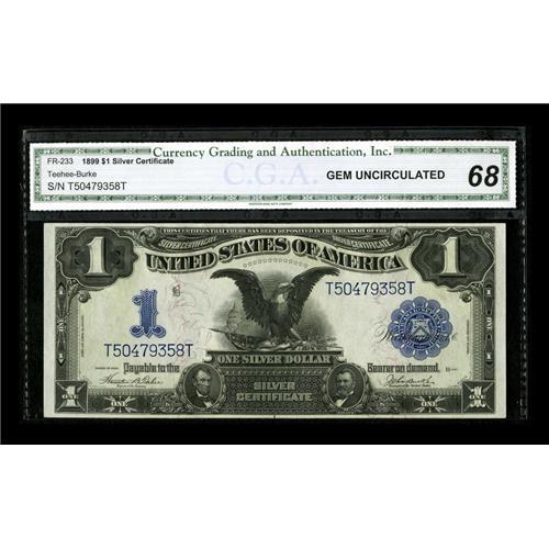 <B>Fr. 233 $1 1899 Silver Certificate CGA Gem Uncirculated 68.</B></I> Not much can be improved upon as the paper is bright and the surfaces well embossed. Super wide and even margins envelope this beauty.<BR><BR><b>Shipping:</b> Coins & Currency (<a target="_blank" href="http://www.heritageauctions.com/common/shipping.php">view shipping information</a>)