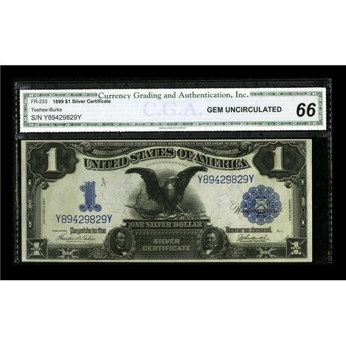 <B>Fr. 233 $1 1899 Silver Certificate CGA Gem Uncirculated 66.</B></I> The face details are about as deeply printed as one will find, the overprint is as deep in color, both of which contrast nicely against the original, wavy paper.<BR><BR><b>Shipping:</b> Coins & Currency (<a target="_blank" href="http://www.heritageauctions.com/common/shipping.php">view shipping information</a>)
