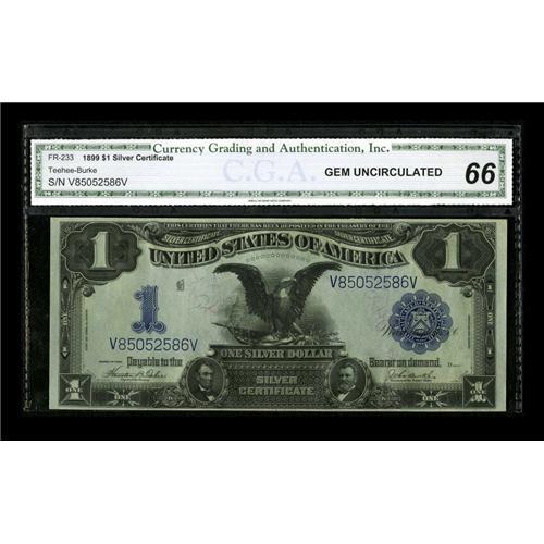 <B>Fr. 233 $1 1899 Silver Certificate CGA Gem Uncirculated 66.</B></I> All the right paper waves are in all the right places on this boldly embossed issue.<BR><BR><b>Shipping:</b> Coins & Currency (<a target="_blank" href="http://www.heritageauctions.com/common/shipping.php">view shipping information</a>)