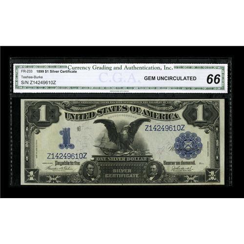 <B>Fr. 233 $1 1899 Silver Certificate CGA Gem Uncirculated 66.</B></I> Here is another typical Black Eagle exhibiting bright color, well inked surfaces, and prominent embossing.<BR><BR><b>Shipping:</b> Coins & Currency (<a target="_blank" href="http://www.heritageauctions.com/common/shipping.php">view shipping information</a>)
