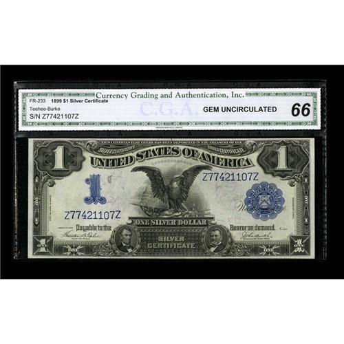 <B>Fr. 233 $1 1899 Silver Certificate CGA Gem Uncirculated 66.</B></I> This nice Black Eagle note has great centering, excellent margins for the issue, and decent paper originality.<BR><BR><b>Shipping:</b> Coins & Currency (<a target="_blank" href="http://www.heritageauctions.com/common/shipping.php">view shipping information</a>)