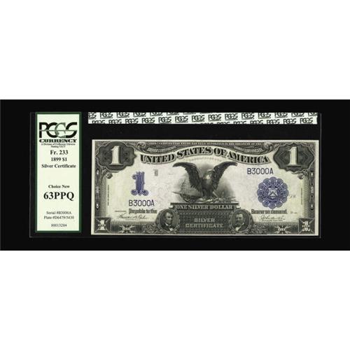 <B>Fr. 233 $1 1899 Silver Certificate PCGS Choice New 63PPQ.</B></I> Fancy serial number B3000A stands out nicely on this well embossed note with natural surfaces.