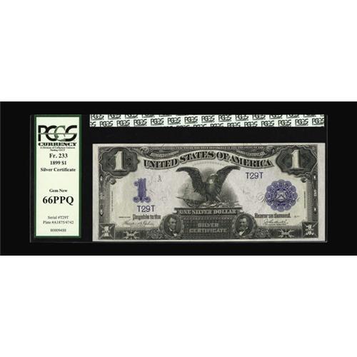 <B>Fr. 233 $1 1899 Silver Certificate PCGS Gem New 66PPQ.</B></I> Two digit serial number 29 is noticed on the blast white, strongly embossed beauty. Reserve one of these fancy numbers now because it will be at least another decade before they appear again.