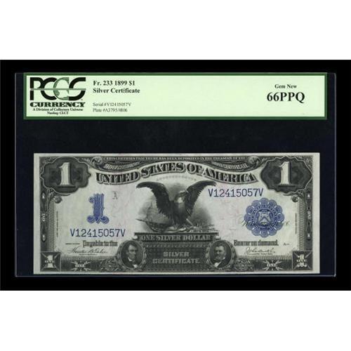 <B>Fr. 233 $1 1899 Silver Certificate PCGS Gem New 66PPQ.</B></I> Beautifully centered and with the bright fresh look that one would expect for a PCGS 66EPQ. Hard to find this nice. <BR><I>From The Walla Walla Collection</B></I><BR><BR><b>Shipping:</b> Coins & Currency (<a target="_blank" href="http://www.heritageauctions.com/common/shipping.php">view shipping information</a>)