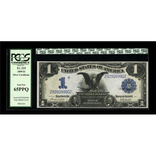 <B>Fr. 233 $1 1899 Silver Certificate PCGS Gem New 65PPQ.</B></I> The overprint is bold and the paper waves remain.<BR><BR><b>Shipping:</b> Coins & Currency (<a target="_blank" href="http://www.heritageauctions.com/common/shipping.php">view shipping information</a>)