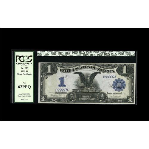 <B>Fr. 233 $1 1899 Silver Certificate PCGS New 62PPQ.</B></I> Two notes away from a solid serial is this well embossed, but tightly margined note.