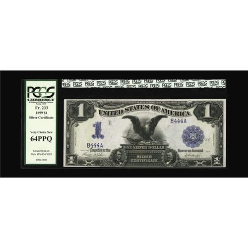 <B>Fr. 233 $1 1899 Silver Certificate PCGS Very Choice New 64PPQ.</B></I> This note would make a pleasing companion to the B555A note also available. Again lovely, original surfaces are noticed, but the bottom margin is a tad tight.