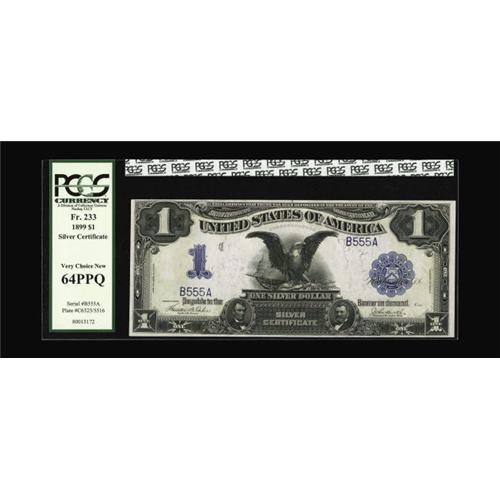 <B>Fr. 233 $1 1899 Silver Certificate PCGS Very Choice New 64PPQ.</B></I> Solid fives make this note stand out against the crowd. A bit better bottom margins and this fancy number note is Gem for certain.