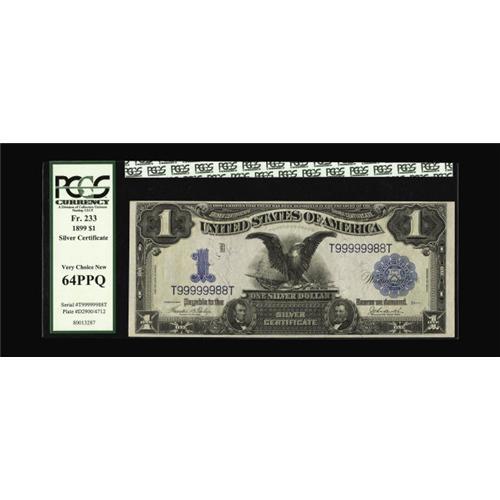 <B>Fr. 233 $1 1899 Silver Certificate PCGS Very Choice New 64PPQ.</B></I> Fancy number T99999988T is noticed on this fully original Black Eagle.