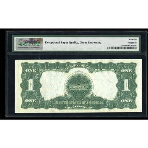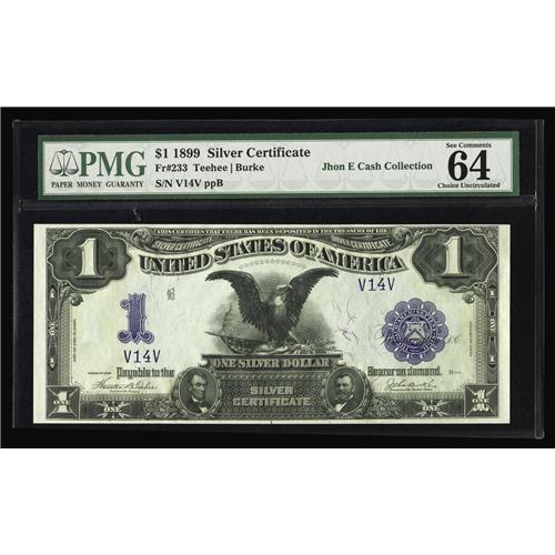 <B>Fr. 233 $1 1899 Silver Certificate PMG Choice Uncirculated 64.</B></I> From the Jhon E. Cash Collection comes this stunning two digit serial number V14V note. This note is not mentioned in the census as are all the other notes in this run. Notations on the holder include "Exceptional Paper Quality, Great Embossing."