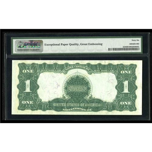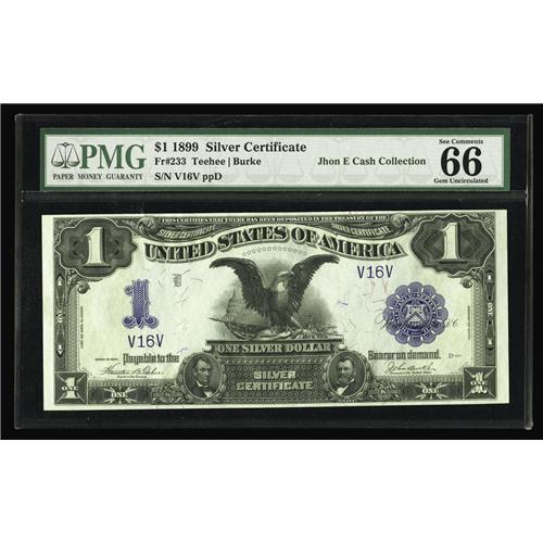<B>Fr. 233 $1 1899 Silver Certificate PMG Gem Uncirculated 66.</B></I> Here is yet another two digit low serial number that is sure to please. Wonderful centering and sufficient margins highlight this wondrous serial number V16V note.