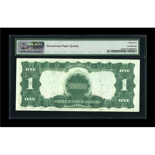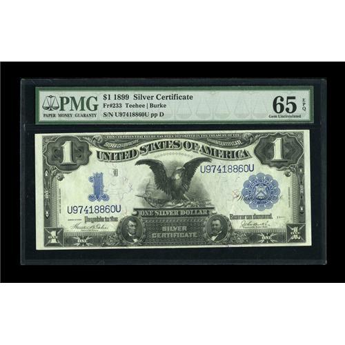 <B>Fr. 233 $1 1899 Silver Certificate PMG Gem Uncirculated 65 EPQ.</B></I> Great front to back centering and bold embossing are noted on this Black Eagle. It is one of a quartet of original, near-consecutive pieces in this auction.<BR><BR><b>Shipping:</b> Coins & Currency (<a target="_blank" href="http://www.heritageauctions.com/common/shipping.php">view shipping information</a>)