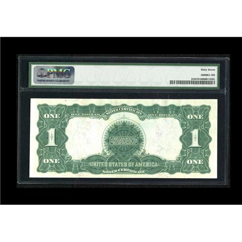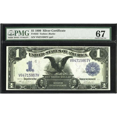 <B>Fr. 233 $1 1899 Silver Certificate PMG Superb Gem Unc 67.</B></I> This is the first PMG 67 example of this Friedberg number to grace one of our Signature sales. As demand skyrockets for material of this quality prices will quickly follow.