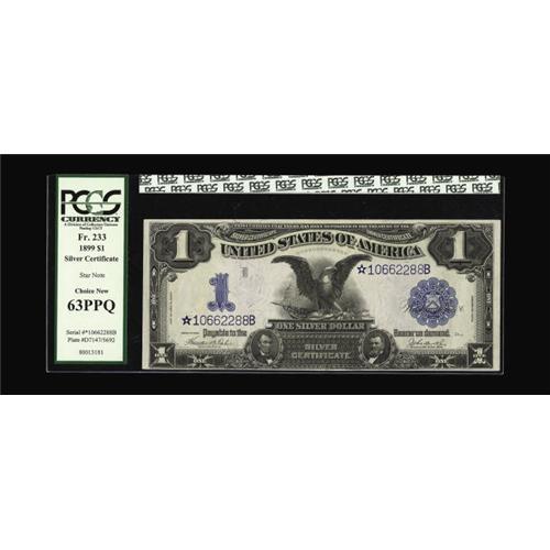 <B>Fr. 233 $1 1899 Silver Certificate Star Note PCGS Choice New 63PPQ.</B></I> Off the market for almost a decade this replacement is only represented by 30 new examples.