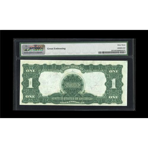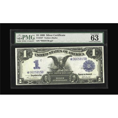 <B>Fr. 233 $1 1899 Silver Certificate Star Note PMG Choice Uncirculated 63.</B></I> This gorgeous replacement Black Eagle has the notation of "Great Embossing" on the back. Nicely margined and bright.