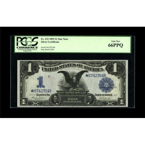 <B>Fr. 233 $1 1899 Silver Certificate Star Note PCGS Gem New 66PPQ.</B></I> Bright and broadly margined, with vivid colors, wonderful paper quality, and tons of eye appeal. While PCGS has not yet released their population census, PMG has graded only one example of this star number higher than 63 EPQ, despite having graded 25 examples to date. If a higher grade star Black Eagle exists, we certainly have yet to see it. <BR><BR><b>Shipping:</b> Coins & Currency (<a target="_blank" href="http://www.heritageauctions.com/common/shipping.php">view shipping information</a>)