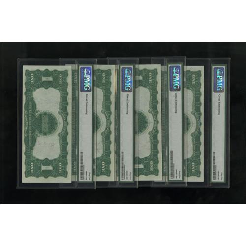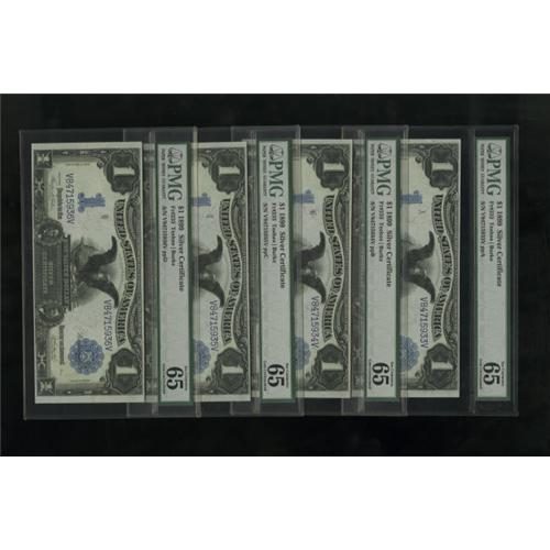 <B>Fr. 233 $1 1899 Silver Certificates Cut Sheet of Four PMG Gem Uncirculated 65.</B></I> Original surfaces are found on this Black Eagle cut sheet that has the modifier of "great embossing" added to its third-party grading labels. This embossing is indeed strong and adds to the vibrancy of these delightful notes. It has been two years since we last had a cut sheet on this Friedberg number.<BR><BR><BR><b>Shipping:</b> Coin/Currency (<a target="_blank" href="http://www.heritageauctions.com/common/shipping.php">view shipping information</a>)