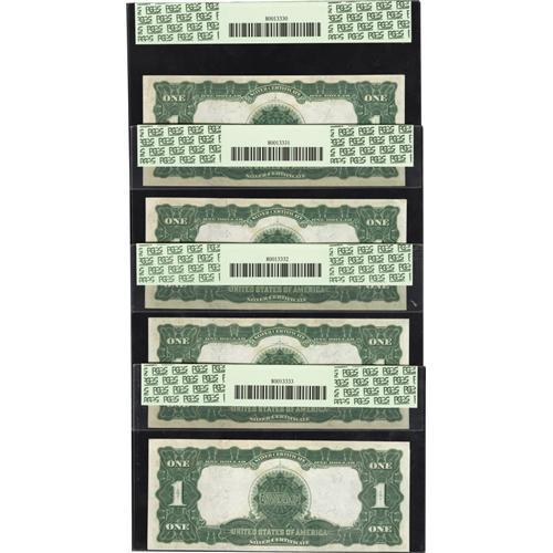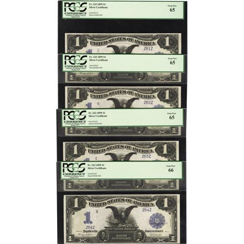 <B>Fr. 233 $1 1899 Silver Certificates Cut Sheet of Four PCGS Gem New 65.</B></I> This cut sheet of Black Eagles sports low serial numbers Z61Z through Z64Z. The inks are still dark after all of these years as this cut sheet is brought to auction for the very first time. Natural paper ripple can also be seen on the back of each note in the area of the top margin. This is a superior cut sheet for this Friedberg number.<BR><BR><b>Shipping:</b> Coins & Currency (<a target="_blank" href="http://www.heritageauctions.com/common/shipping.php">view shipping information</a>)