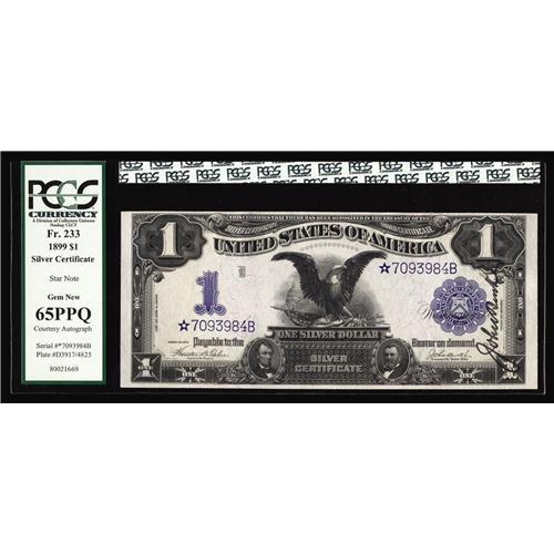 <B>Fr. 233* Courtesy Autographed $1 1899 Silver Star Certificate PCGS Gem New 65PPQ.</B></I> Treasurer of the United States John Burke boldly signed his name vertically to the right of his engraved signature on this Black Eagle Star that can be traced all the way back to the second Grinnell auction as lot 992 in 1945, where it realized all of $5. According to the Gengerke census, this is the only Burke autographed Black Eagle for this Friedberg number in either Star or regular form. Combine this unique autograph with the outstanding quality of this embossed $1 Silver Star, and this beautiful Ace could easily surpass its low estimate.