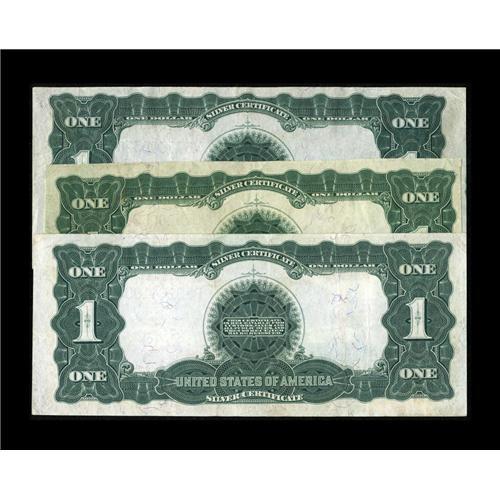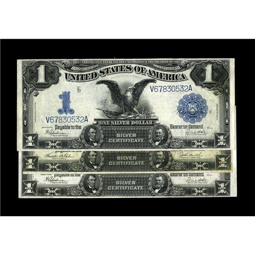 <B>Fr. 233, Fr. 236 $1 1899 Silver Certificates Three Examples.</B></I> This trio of lightly circulated Black Eagles all grade <B>Very Fine+.</B></I> The Teehee/Burke note has been trimmed a bit.<BR><BR><b>Shipping:</b> Coin/Currency (<a target="_blank" href="http://www.heritageauctions.com/common/shipping.php">view shipping information</a>)