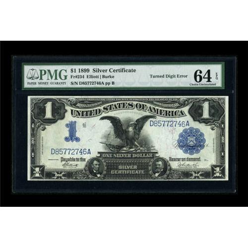 <B>Fr. 234 $1 1899 Silver Certificate PMG Choice Uncirculated 64 EPQ.</B></I> This lovely Black Eagle has been designated as a "turned digit error" note. The final digit in the upper serial number is noticeably shifted downwards.<BR><BR><b>Shipping:</b> Coins & Currency (<a target="_blank" href="http://www.heritageauctions.com/common/shipping.php">view shipping information</a>)